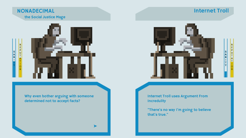 2) Players face an endless series of one-on-one arguments with trolls. There is no victory condition so only 3 eventual outcomes are possible for the player: their mental faculties are worn down by conflict, their reputation is obliterated by the troll’s defamation or their own, or they ragequit. I hope players become more cognizant of the personal cost of engaging caustic individuals relative to what society will gain from the argument.